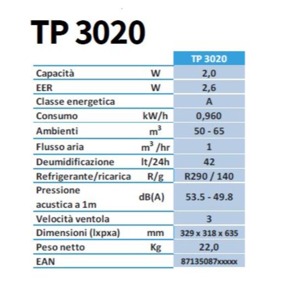 Il Tectro TP3020 è un condizionatore portatile che vanta un consumo nominale massimo di 0,960 kW (consumo nominale in Standby di 0,43 watt) e con oltre 2000 W di potenza e che appartiene alla classe di efficienza energetica A. Il climatizzatore si adatta ad ambienti fino a 50-65 m³.